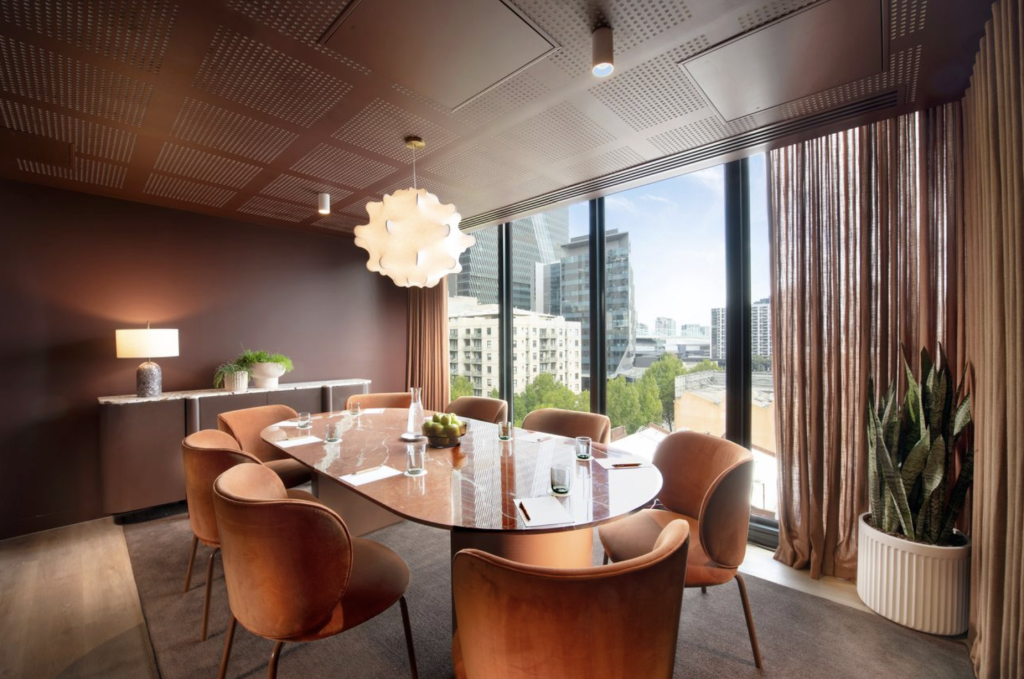 The 18-storey hotel features interiors designed by Sora Interiors and the hotel tower reimagined by LiFE Architecture, houses six suites, a restaurant and bar, and a gym. The lobby’s aesthetic draws from the site’s history as a tinsmith factory, most notably in an abstract artwork depicting tin offcuts that once would’ve littered the floors. The industrial nod is set against a travertine reception desk, soft lighting and sheer drapery, which give it a calming retreat-like feel.